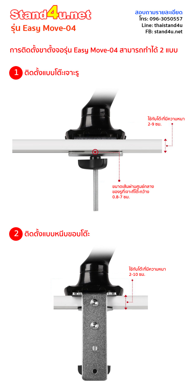 - ติดตั้งได้ทั้งแบบหนีบขอบโต๊ะ และโต๊ะเจาะรู